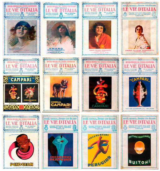 The covers/manifestos of Le Vie d’Italia. Top: Giuseppe Palanti (1881–1946) for Amaro Felsina Ramazzotti (October 1921, February 1922, May 1923, January 1931). At the centre: Leonetto Cappiello (1875–1942) for Campari (September 1922, December 1923, December 1924, December 1926). Bottom: Federico Seneca (1891–1976) for Perugina (October 1926, May 1928, November 1929) and Pasta Glutinata Buitoni (May 1929).