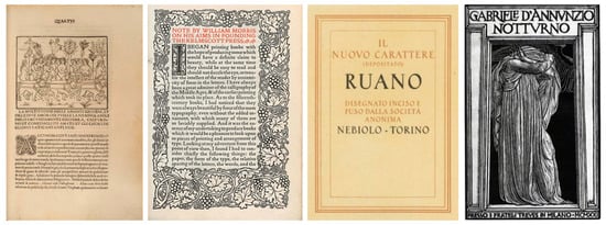 The references. Manuzio, Hypnerotomachia Poliphili, Venice, 1499; William Morris, A Note by William Morris on His Aims in Founding the Kelmscott Press, Hammersmith: Kelmscott Press, 1898; Raffaele Bertieri, Il nuovo carattere Ruano, Turin: Fonderie Nebiolo, 1926; Adolfo De Carolis, the cover of the Notturno of Gabriele D’Annunzio published in 1921.