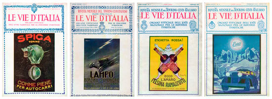 In this direction, the most authentic spirit of the Association encourages Italians to make themselves “interpreters of intelligent travel” and discover the soul of Italy—fleeting, fluid, hidden—in the Alps and Apennines, in the plains and marine panoramas, in archaeological remains and medieval basilicas, in the confused noise of the hammers in Milan’s industries [] (pp. 197–198). In line with this intention, Touring’s publicist is intentionally situated at the frontier between “travel and tourist literature” [] (p. 8), proposed not as simple, practical support for the trip, but as a journey itself.
