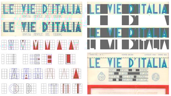 Luigi Vittorio Bertarelli died in 1926 and in 1927 a decided regression was made in the graphics on the cover (Figure 5). First of all, the characters: the slightly angular ski-shaped form—swallowtail—of the ends of the letters is transformed into curves and, contextually, all the horizontal strokes are redesigned according to a heightened wavelike movement. Then the frames: a simple border is adopted made of small tracts alternating about an ideal axis of symmetry. Finally, the crest of the Kingdom and the Touring logo are placed symmetrically to balance the wording Organo Ufficiale dell’Ente Nazionale Industrie Turistiche.