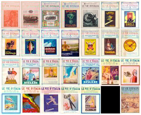 The covers of Le Vie d’Italia become the walls of the homes “in which hundreds of sheets of painted paper accumulate, blend together, follow each other” [] (p. 10). They are walls in a virtual city that, transformed into a permanent exhibition, is tumultuous, agile, dynamic, and which identifies in industrial society and in the form of publicity the legitimacy of the new aesthetic and the new art: the art of advertising [].