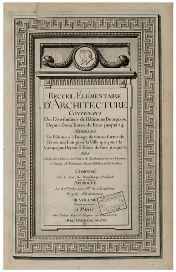 - Szambien, W. Construire pour toute personne le toisé de l’architecture. In Symétrie. Goût. Caractère. Théorie et Terminologie de L’architecture à L’âge Classique. 1500–1800; Picard: Paris, France, 1986; p. 30. [Google Scholar]