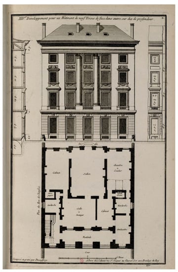 Across the whole treatise, the representation used by Jean-François de Neufforge as a medium of the new architectural image are the plan and the elevation of the building which are related with proportional relationship and spatial reciprocal implication dictated by the use of the architectural order. This becomes the device which defines the correspondence of the parts with the whole, the element with the structure, the column with the building and the individual with society (Figure A3). The visual shape is determined by the interdependence existing between two representations of the same object and by reconstructing an unambiguous tri-dimensional image which becomes the geometrical and architectural model. This organisation of the representations is not only shaping the architecture, but also generates the meaning [] which sets the new imaginary: the founding principle of the PLAN express how the architecture should seize the ground and the expressivity of the façade of the ELEVATION represents its public facies (Figure 5 and Figure 6).