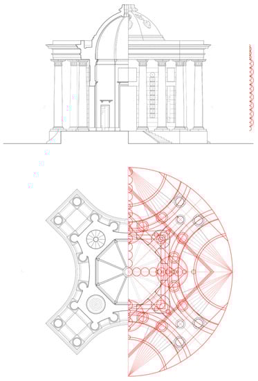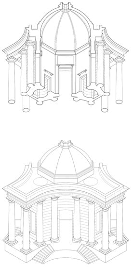 The sequential identification of the archetypal figures, which compose the buildings, begins form the definition of the centrality of the walled cell—intended as a vacuum space in which the other part relates in proportion—then the individuation of the base on which the construction is elevated and finally determining the trajectory of the dotted border of the building that is the peristyle (Figure A2). The profile of the crowning element, which defines the upper limit of the roof/cover, is determined by the construction of the elevation by the rule of the selected order. The gradual growing of the architectural shape through the stratification of geometries and proportional relationships explains how the construction of complex elements in a composition, and the following attribution of architectural meaning to those elements, brings to the disappearance of the initial signs, determining a unique image fixed in the bi-dimensional space. This representative process clearly hybridise architectural models from which the elements are progressively deduced. These elements blend in the elaboration of the plan, losing their original and well known individuality to become part of the whole (Figure A4).