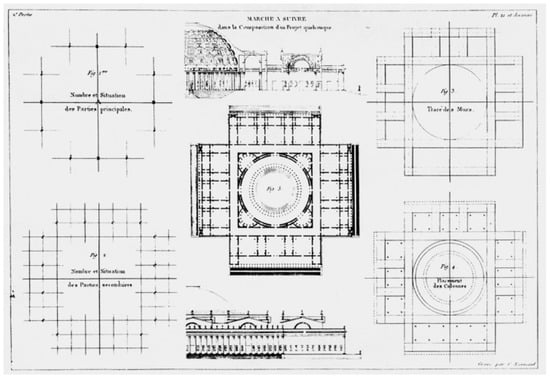 In this way, the author, by marking the encyclopaedic spirit of his work, creates a device which can expedite comparison of single categories helping the architects to select the more suitable style for the use of the building for a particular project. The author represents different elementary visual variations without reporting the geometrical matrix in a unique form. On the contrary, Jean Nicolas Louis Durand will later explicit the composition rules in some tables of his work Précis des leçons d’architecture données à l’École Royale Polytechnique and in particular in the “Marche à suivre dans la composition d’un projet quelconque” (Figure 7) and “Ensamble d’édificies résultants de la combinaison horisontale del leurs parties” []. In J.N.L Durand’s tables it is adamant the construction process of the planimetric figure of a general building. In this work, the sequence of five plants which initiate from a scheme based on the crossing of two axes, expand with the introduction of grids and elementary figures. These figures stratify defining progressively the walls and the spatiality of the building. On the other hand, in Jean-François de Neufforge’s tables representing a series of building for collective and commemorative use, the figure of plan in its formal complexity, often defined by the use of the schematic principle of the interpenetration [], is the unique representation that needs a geometrical interpretation as formal de-codification to support the project []. The interpretation begins from the determination of the measuring module and takes to the definition of the latent scheme to be replicated or modified.
