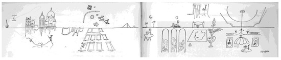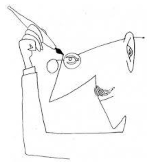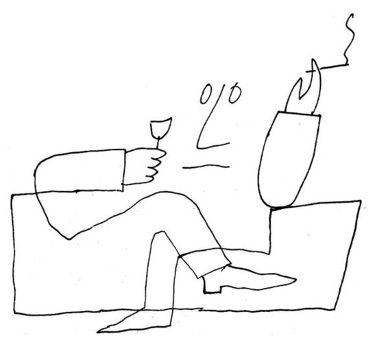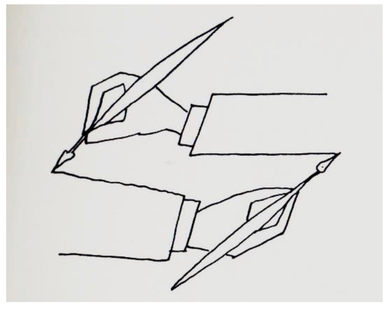 The bizarre coincidence has already been pointed out [4,5,6,7], that a Steinberg drawing (Figure 3) [8], placed at the margins of a page of his volume The Passport (1954), clearly recalls an Escher lithography (Figure 4), Drawing Hands (1948). Escher himself, in an interview [9], was amazed by this correspondence. In both images, two hands hold a stylus. Each hand draws the other and it just seems that they act at the same time. The two images are then frozen in a sort of circular paradox: each hand is together ‘cause’ and ‘effect’, object of drawing and active subject. There is no beginning or end in the action that is represented; the observer is involved in a narration of time free from the common categories: the perpetual development of the action represented makes it impossible to see a beginning and a fulfillment.