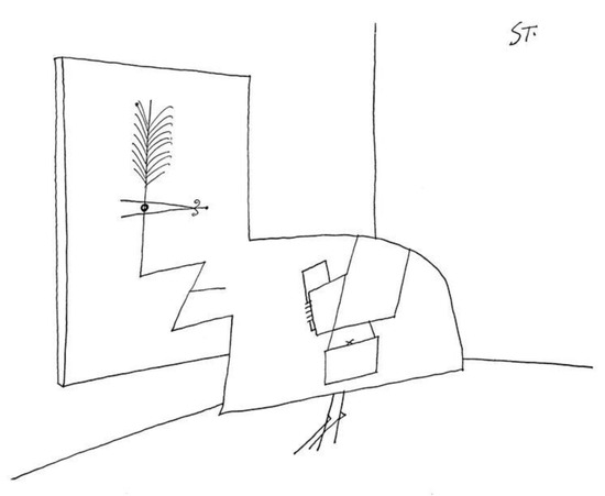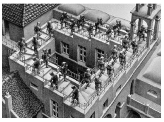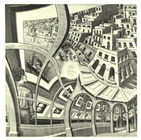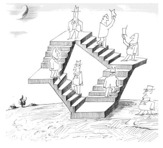 Douglas Hofstadter [15] in the late 1970s described in an original way the conceptual affinities that link Escher’s work to the sense of the first Gödel’s incompleteness theorem, according to which it is possible to construct a syntactically correct proposition that cannot be neither demonstrated nor refuted within the same system. In the field of graphic representation, the internal coherence of an image, as Steinberg and Escher demonstrate—as well as Magritte—cannot in any way be a guarantee of its truthfulness or of the fact that it can establish a functional biunique relationship with identifiable aspects of reality. In spite of their mutual technical, formal and general mood, their graphic narrative, Escher and Steinberg show that they were both pervaded by the same anxieties and the same spirit that in the twentieth century, in addition to the truths derived from formal logic, crush the solidity of other representation systems. Even through the astonishment aroused by Escher’s work or Steinberg’s tasty humor, this awareness has crossed the cultural milieus of the last century.