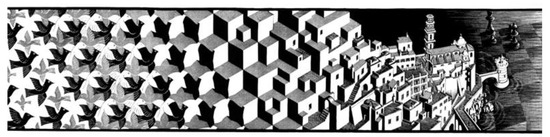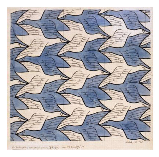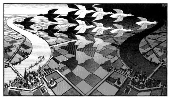 One of Escher’s dearer themes is the relationship between the figures and the background within the same image. Ever since his second trip to Spain in 1935, he was deeply hit by the Alhambra mosaic tassels that portray abstract geometric designs in which a similar shape can tap the floor with contrasting color elements. After carefully studying these figures he devoted great passion to a study on the regular division of the plane and produced hundreds of drawings in which animals, human figures, abstract shapes perfectly fit on the plane (Figure 9) [12]. Many of these works became basic materials for more complex works such as Day and Night (Figure 10), where not only two flocks of ducks flying in different directions fit into perfection but at the bottom of the image the forms of birds changes in the form of fields in the background.