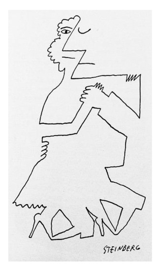 Steinberg, on the other hand, faces the same theme by focusing his attention on the contour line between the different elements, as can be seen in the drawing representing the dancing couple (Figure 11) or in the one with a man sitting in armchair (Figure 12), both published on The Passport. In drawing the contour between things, sometimes even with a closed line, Steinberg does not isolate the figures, some of which lie on the line between the completeness of the description and belong to the indistinct field of the white background. In this way the shape of the leg belongs to the same pattern as the pillow that makes it the background, the body is described by the lines that define the armchair and the face can be composed of features that ‘float’ on the sheet field.