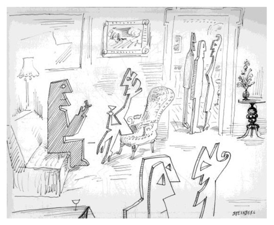 Another common theme for the two authors—immanent at the same statute of graphic representation—is that of ambiguity between two and three-dimensional elements. Escher has often made drawings, representing images where the content was of two-dimensional nature. In a color lithograph (Reptiles, 1943), a flat floor tile is depicted with images of small saurians that, coming out of the sheet and acquiring three-dimensional solidity, make a round of some objects on a table before returning to compose the mosaic on the sheet (Figure 13). Likewise, in Three Spheres of 1945, ambiguously represents a solid sphere and two other images of the same sphere that are the perspective representation of two-dimensional elements. In a rather different way, Steinberg has populated social gathering places, such as a living room during a party, with bizarre human figures that are basically flat, with no thickness, consisting of purely two-dimensional silhouettes (Figure 14).