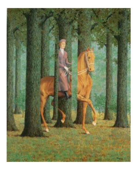 Magritte has also developed in his works the game of ambiguity between the figure and the background. In 1928 Les Jours Gigantesques, for example, is the contour of the female figure that ‘cuts’ the boundaries of the male figure as well (Figure 19). Both bodies, however, are placed on a gray field. In this way the two figures appear fused, without either of them clearly recognizable as background. Even more in the framework of 1965 Le blanc seign (Figure 20), Magritte in representing a woman on horseback among the trees, fragmented the figure by superimposing to it not only the shape of nearby trees but sometimes the one of the furthest trunks and in one case also a free space which would have optically remained in the background. In this work, figures and background seem to alternate without any spatial logic and exploration of the picture traps the observer in a world characterized by the semblance of reality but physically inconsistent.