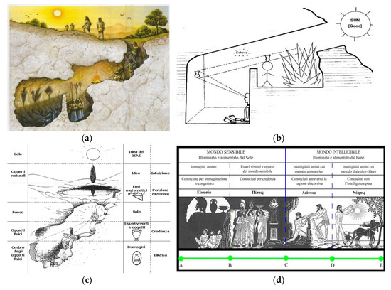 The ‘shadows’ are the prisoners’ reality (knowledge by conjecture = εἰκασία). The ‘free prisoner’ is the philosopher who can contemplate the true knowledge, the ‘form’ of reality (intuitive and direct knowledge = nόησις) thanks to the ‘sun’ that represents the real ‘good’—Figure 3b,c. The human condition is so described: humanity believes that knowledge comes from reality (shadows) but few know that true knowledge comes from the contemplation of good (sun).