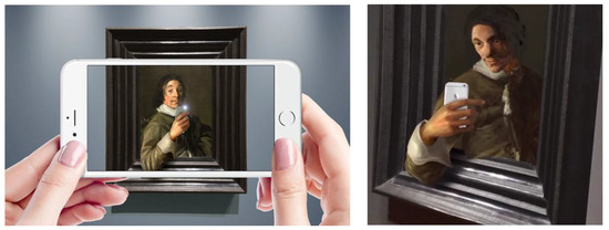In this respect some young artists working in the digital field use augmented reality within museum fruition in a really original way and in a recreational/collaborative dimension that moves users to deal with the works through a creative reinterpretation developed in a modern way. A meaningful example is ReBlink—project hosted by Art Gallery of Ontario (Toronto) in 2017—developed by the artist Alex Mayhew; thanks to such project the works of art displayed in the museum can be animated thanks to a personalized application for smartphones and tablets. The characters portrayed in some paintings, animated and brought to the contemporary world, begin to interact with the visitor (leave the frame, take selfies…). In this way reality and imagination become interwined and as a result past art is put in relation with new generations and opens the way to creative experimentations (Figure 3).