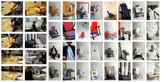 Within the trial, no choice could be imitated, and this thus led to a wide number of new variants of the Rietveld chairs (Figure 5). It was not a matter of mimicking the original project, but of taking a first step towards a more ambitious personal meta-project, the aim of which was a transposition, a process of interpretation [15], able to create a relation between form, space, relationship with the body and its needs, and with the emotional and cultural stimuli aroused in the young future designers.