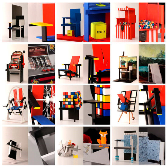 Gerrit Rietveld designed the Red-Blue chair (in Dutch: Rood-blauwe stoel) in 1917 and after producing a prototype of the chair in 1918, it became one of the most significant examples of Neoplasticism given its strict application of the typifying concepts of De Stijl, [8]. The Rood-blauwe stoel was declared a manifesto by supporters of De Stijl already in its first version, which was uncoloured. The chair was painted in primary colours plus black, only in 1923, when the object was described by Theo van Doesburg as an “example of furniture as abstract, realistic sculptures for our future interiors”, [9]. In 1923, Rietveld also designed the Berlin Chair specially for the Dutch exhibition in Berlin. The chair was the first asymmetric piece to be designed by Rietveld: in it, the traditional elements (legs, arms, seat and backrest) were abandoned in favour of a system of interconnected panels fitted in a balanced asymmetry, [10]. Made of high-quality lacquered beech, it was offered painted in white, grey and black, [11]. During the course of a century of studies of the Dutch architect and craftsman, a number of elaborations and reinterpretations of the piece have been made. Recently, the didactic experiments linked to the redesign and re-interpretation of design in Italian universities (by professor Cecilia Polidori, for example) and internationally (see the activities of the Gerrit Rietveld Academie, in Amsterdam, The Netherlands) have shown how the perception and interpretative ability of students can be significantly stimulated in a very promising process.