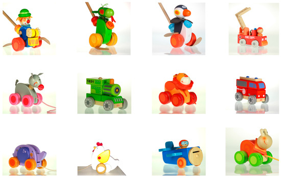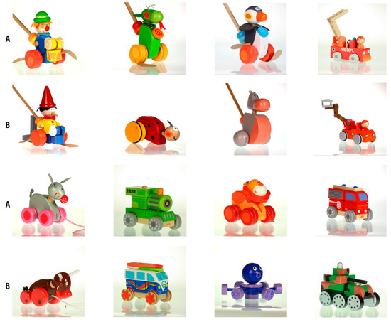 Original Sevi’s toys (A) and their metamorphosis; (B) wooden models by the students of the course.