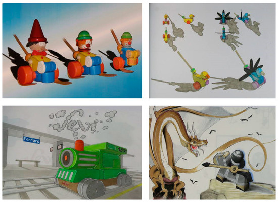 Hand drawing concepts by students representing the toys’ metamorphosis in imaginary locations.