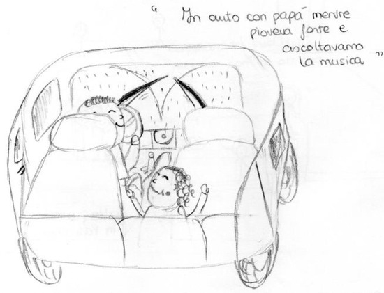 Although it may only be one of the factors involved in the formation and recovery of autobiographical memories, emotional intensity fixes memory traces in the memory system and makes them more vivid over time. It can be assumed that personal meaningful events with high emotional intensity help to give a sense of continuity to one’s own life story, producing emotional landmarks for the organization of autobiographical memory. In our study we found that those memories with a high emotional intensity were often accompanied by a large number of details in the drawing, almost reproducing the vividness of the memory trace. For example, Figure 1 shows a drawing referring to infancy entitled “In the car with my dad, while it rained heavily and we listened to music”. The strong emotional activation of the characters is clear thanks to the facial expressions and the child (the drawer) that raises her arms (maybe to move them to the rhythm of music).