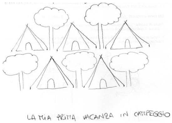 The school, with its various environments (sometimes represented in detail, such as a particular corridor, the classroom, the school canteen and the garden of the school where recreation time was spent), is in fact the space in which children and teens spend several hours of their lives. It is therefore normal that they are included in meaningful autobiographical memories. In Figure 3 the place is used to symbolize the memory contents: the individual’s first camping holiday.