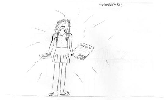 Several participants have chosen to represent, as a meaningful memory, things such as, a particular school oral exam, the examination for their high school diploma, efforts to have a boyfriend or a girlfriend, obtaining their driver’s license, etc. In Figure 5, the drawer of the memory, with a big smile of joy and pride, holds in her hands the evidence of two adolescence achievements she has obtained: her driver’s license and her high school diploma.