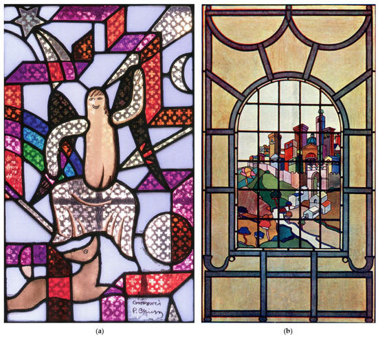 - For an overview on the development of artistic shops and glass processing in north-central at the beginning of the twentieth century see Castanò, F.; Mingione, G. Le vetrate istoriate di Pietro Chiesa e di Giulio Cesare Giuliani nello spazio liturgico di primo Novecento, VIII Congresso AISU, Napoli. 2017. [Google Scholar]