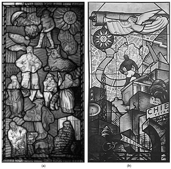 At the center of the room was a bronze sculpture by Antonio Maraini, entitled Bagnante, and on the walls around were Chiesa’s windows (Figure 2). The most important, regarding to the theme, are Strapaese (Figure 3a) and Stracittà (Figure 3b), respectively on Achille Funi and Tomaso Buzzi’s composition, representative of a contrasting cultural and literary climate in which the two movements took life. The two themes «art and literature not only of an immediate yesterday but a more remote time», represented «a contrary view, not only of art, but of the world and of life» [24]. The contrast, predominantly fed by differences «in prose and in verse», was in Carducci and in the current of the «manzonismo» [25] his most famous exponents. The advent of modernity aimed «to immerse themselves in art forms refusing or caring very little for Tradition» [26] had tightened this divergence creating two factions; in particular the Stracittadini claimed that the style «must be found in the modern world we live in», the Strapesani stated instead that it was to be found «if not exactly in the ancient». The diversity of their movements is also reflected in the windows, animated by stylistic elements and completely different shapes. The first is characterized by a background intense cobalt tones in which the figures and animals appear “suspended”, without there being any attempt to frame a space devoid of any prospective reference. Under the sun and the moon, the stars that characterize rural life, parading in a disorderly manner typical subjects of a still agricultural countryside, dedicated to cultivation and farming. Impressive the use and the charge of the chromaticities that are so contrasting, to the point of clashing with the space-time calm of the glass. The second glazed, Stracittà, is rich in an upward tension, a force almost “vector”, as indicated at the top by an arrow. A strong appeal to the work of futurism, a powerful modernity made of obelisks with metallic and reticular structures, signs which emerge from one another close to the other as in a chaotic contemporary metropolis. All this, however, opposes a latent nostalgia for the classical world, in fact the window is full of temples, pyramids, statues, mannequins, strong connections with the metaphysical hemisphere. An angel with his shrilling trumpet dominates the scene, derived from the opening of a large scroll.