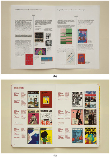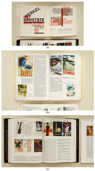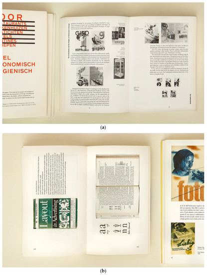 In other leading publications in the field (Figure 2a–e), the selection and positioning of images is apparently based on design decisions which were not strictly related to the text, or were beyond the control of the authors. The results are layouts where dramatic changes in scale can be found, with some items presented as full page reproductions—which inevitably attracts attention to them regardless of whether they are historically important or not. On the other hand, the opposite can happen: pages where items, which are originally different in scale (such as posters and book covers, for instance), are levelled out by their having been adapted to the standard size of the image grid. This is of course not always the case, but the issue should be considered when using these books as reference or teaching material.