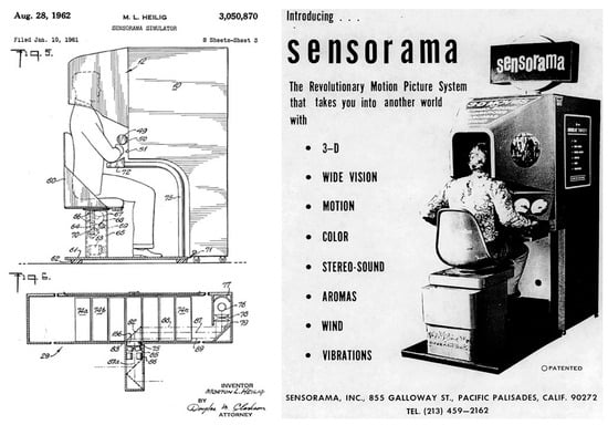The earliest developments to produce such an effect were stereoscopic views, holographic stereograms, and 3-D cinematic experiments on large-screen projection. In a 1950s project called the Experience Theater, Norton Healing introduces a prototype of a first virtual environment, still a mechanical one, made in 1962 under the name “Sensorama” (Figure 2). This device was based on a predetermined perceptual model, not specifying a personalization of experience, yet lacking interactivity with the immersive feature []. The head-mounted display (HMD) is a stereoscopic binocular device capable of sending different information to each eye, but the first real-world virtual viewer created by Ivan Sutherland, who was the creator of the current point and click system (Sketch pad5): on the occasion of MIT 1966, the researcher designs the “Sword Of Damocles”, the imaginative name derives from the fact that the machine was equipped with a number of ropes that were rudely attached to the ceiling, connecting an HMD viewer to the computerized system. The device recorded movements of the head of the user by returning the exact perspective to the simulated stereoscopic vision. The first hypermedia virtual system was built during MIT 7 in the late 1970s and named “Aspen movie Map”: this is a virtual reconstruction of the city of Aspen, Colorado, where the user could explore the city in 3 different modes, summer, winter and polygonal wireframes. In 1979, NASA created “Polhemus 3dSPACE”, a system of sensors that can detect the location and orientation of points in space, a useful tool for creating complex and realistic virtual environments, and future incentive for the development of polygonal modeling , first in the commercial field of entertainment and then in the field of scientific use in the most diverse sectors. In 1982, Thomas Furness developed the “Super Cockpit”, a flight simulation system designed to assist the formation of high-speed aircraft pilots. In 1992, Tom DeFanti and Carolina Cruz-Neira conceived the “Cave System”, which is one of the most advanced and sophisticated virtual reality displays of the past generation. With a holographic screen divided into 3 sides, varying according to use, participants could be surrounded by high-resolution projected images and interacting with them with the first motion sensors.