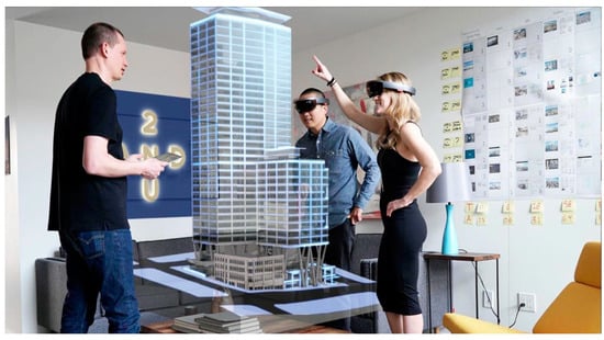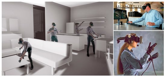 Virtual reality does not imply that only devices involving vision and hearing are hoped to include the participation of other senses, so experimentation goes slower than the evolution of visual simulations []. An important aspect of this technology could offer users the feeling of pressure, consistency, strictly aimed at interacting with various objects and materials. A significant example was developed in 1968 by Frederick Brooks, of the University of North Carolina, in order to manage radioactive materials through a remote manipulator device to simulate force-feedback. In 1980, a joystring was developed by Richard Feldman to generate adequate pressure levels through manipulation but the tool was very expensive and usable only in certain areas. Only recently, thanks to the commercialization of the existing virtual interactive simulation tools, virtual technology is evoked and solutions are being developed to recreate artificial aptic sensations along with the ever-evolving visual simulation. The “Oculus Rift” project starts from a fundraiser kickstart of 2014, undertaken online by a group of young researchers led by Palmer Luckey, demonstrating the possibility of cost-cutting along with maintaining quality in the creation of a Hmd virtual instrument. We are experiencing a virtualization-based phenomenon within a workflow that is also very dissimilar to each other, together with the creation and dissemination of new professional formulas, specific to device testing, the creation of usable apps through smartphones and tablets, but above all related to the architectural and artistic realization of scenarios, consisting of buildings, cities, but also trees, animals, creatures from artificial intelligence or avatars impersonable by other human users, universally infinitely expanded and more complex and realistic than the past, the creation of which requires an ever higher level of competence. Another type of contemporary application, based primarily on holograms, and hence on AR, is Microsoft HoloLens. Still very expensive to become a common object, it promises to revolutionize the market, radically transforming the way of interacting with the real world: unlike the Cave VR screens it is a real computer in the form of a viewer, equipped with advanced sensors, relatively light and above all without any connecting cable, ensuring maximum freedom. Following the principles of increased reality, or better mixing reality, HoloLens blends spaces and real contents with spaces, space portions, and virtual 3d objects that can interactively be manipulated or digitally modified. According to recent studies, common element is the extreme perceptual realism between the hologram and the real elements, the lack of side effects of nausea, the fact that they can continue to see the surrounding reality, and a perfect overlapping of the elements, including complex, digitally reconfigured. Immersive devices, both based on VR technology such as Oculus Rift or Holografic AR such as efficient HoloLens, always have the advantage of allowing a very high sensory involvement to the user’s visitor, without using predefined paths such as happens in a cinematic video, it can change its exploratory journey in real time by intervening with unprecedented actions. The Vr system also allows communication between speakers from different cultural backgrounds by linking “knowing” and “experimenting” about the topic addressed, by experimenting and learning the knowledge of data thanks to a better emotional narrative, able to impart in the deepest memory the notions through the images. It is evident from the experiences analyzed the potential in the change offered by the use of these innovative design methods, which are surely immature for a capillary and complete technical overlap with common habits, but which are already capable of major advancements in compositional intervention on Architecture (Figure 3).