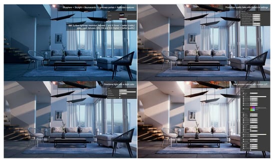Beyond the good intentions of EyeCad and its super easy-to-manage interface, Unreal Engine looks like a far superior instrument, offering many more features not only related to the visual simulation of lighting but about the same scene editing, resembling much more software like 3dStudioMax or Cinema 4d modeling and three-dimensional composition. (Figure 7) The very well-balanced parameters of each element in the scenario allow not only the most elementary functions of geometric and parametric transformation of 3d assets, but also offer interesting internal polygonal optimization, collision management, particle editing functions related to simulations mists, vapors or liquids, a good digital fiber simulation, a complex and intuitive material management node system and animated interactions, automatic UV map creation and more. Unreal Engine 4.15 therefore reveals a program that can be used by both first-rate users and experienced programmers, always delivering very good visual and graphical results. Negative notes, however common to both systems analyzed, reside in the impossibility of using multiple GPUs for simulations, which would improve performance by increasing the frame rate viewable in rendering, and by the lack of a self-calibration system of the Oculus Rift based to the potential hardware that may be used, which could improve the frequency of virtual viewer usage even in architectural editing, which is still a bit uncomfortable despite the already commercially implemented special ergonomic pads for interactive virtual object control. As for the economic aspect, it can be said that both programs can be considered rather cheap, although the system produced by the Epic Game, in line with its closest competitors such as Crytek Engine [] and Unity [], has put Freely available for freelance and scientific research, its virtual interface, intelligently creating an expansive expansion market, specific plug-ins, 3D compliant assets, preset scenarios and extra paid features to which users can access more experienced.