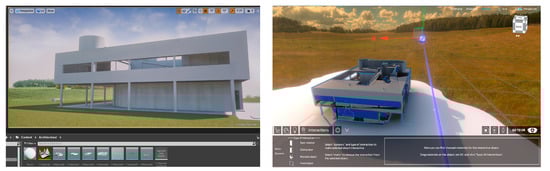 Comparison between the two analyzed software. (a) Unreal Engine RTR Interface; (b) EYECAD VR, Intuitive interface, interaction management panel.