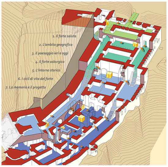 Forte Corno belongs to the third generation of forts built in Trentino by the Austro-Hungarian Empire, the so-called mountain forts or Gebirgsfort; designed and built between 1883 and 1890. At a height of over 1000 m, the fort dominates the landscape of the high valley of the Chiese [5] (Figure 1). The architecture documents in an exemplary manner the time of the transition from the first military buildings, characterised by formal and compositional refinements, to the last reinforced fortresses, which employed new construction and functional rules. The fort comprises five levels, each partially excavated in the mountain with a clear separation between the top floors, assigned to the quarters and services for the troops and the lower levels comprising the premises for heavy pieces of artillery. The fort was never operational: by 1915 it had been decommissioned and disarmed, and in the following decades underwent rapid decay on account of such natural and anthropic causes as the infiltration of water, the growth of weeds and shrubs, structural failures, and the removal of iron sections, wooden ceilings and flooring.