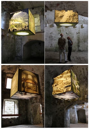 The installation created for Forte Corno and that proposed for the Roncogno Battery are both based on the idea that exhibition images cannot be freely moved insofar as each is conceived for a definite architectural space: the stones from which variously placed cubes emerge in the first case, and surfaces of the barrel-vaulted rooms covered with panels of varying sizes, in the second. Notwithstanding the exclusive use of images produced by digital processing that increasingly lead us to forget their physical support, the two experiences discussed in these pages indicate how the characteristics of the support for an image are not of marginal importance with respect to an image’s information content; some of such supports’ components (morphological, dimensions, material) participate in an essential manner in the creation and transmission of the visual message [8].