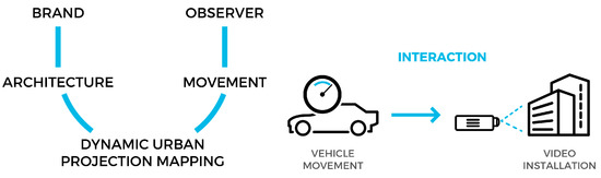 “Dynamic projection mapping” is a variation of the best-known “projection mapping”. It considers the perceptual analysis of the urban landscape in which the video projection and the observer’s displacement speed are hypothesized. This latter, in particular, is variable and may depend on factors not directly controllable by the driver (slowdowns due to accidents, rallies, etc.). This speed can be supported and controlled by a number of traffic flow measurement systems. These data are available on the internet, like Google Maps APIs and/or speed sensors located close to the point of interest. The content of projection becomes dynamic and varies according to how the observer perceives the vehicle: slow, medium, fast.