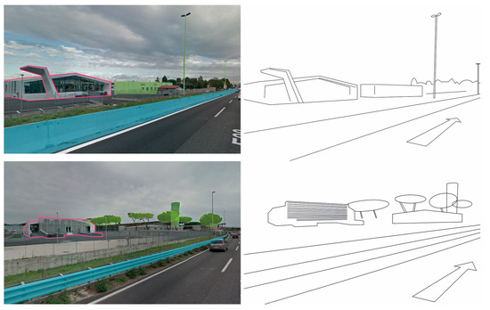 In line with Cullen’s studies, the perceptual influence is analyzed in a more specific way and from the eye of an observer inside a car (Figure 3). The analysis focuses on identifying the predominant characters of the visual field and, consequently, on their perception, marking them with different colors. The front side of the showroom (external carriageway of GRA) is a contemporary architecture that can be clearly distinguished from the surrounding landscape. The back of the showroom (inner carriage of GRA), on the other hand, has a simpler and more compact architectural shape.