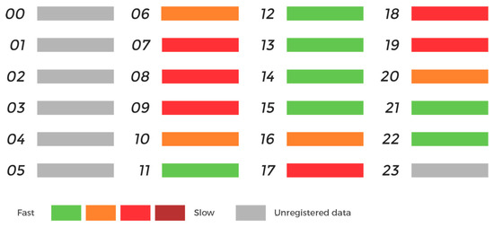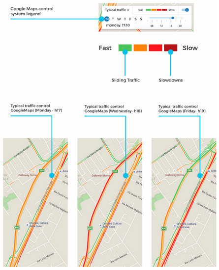 Another traffic flow analytical tool in the area of interest—related to time slots—is publicly available through Google Maps application (Figure 4). The application embeds a system displaying the vehicle flow with real-time monitoring. Its ease of use and friendly nature is within the reach of any user. We took into account the evaluation scale used by Google Maps and some samplings in the area around the “showroom” on the East Section of GRA.