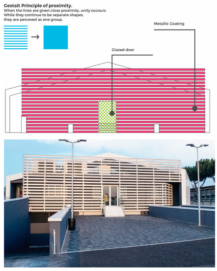 On the back of the building, a single projector positioned frontally is sufficient (Figure 7). The projection surface consists of a series of horizontal metal strips, arranged in regular bands with an empty space between them. Taking into account the principle of proximity of Gestalt and the distance from the observation point, motorists perceive the facade as a single surface. For a proper viewing, however, it is necessary to avoid multimedia content with small-sized details. These would be poorly visible due to the shape of the coating structure (Figure 10).