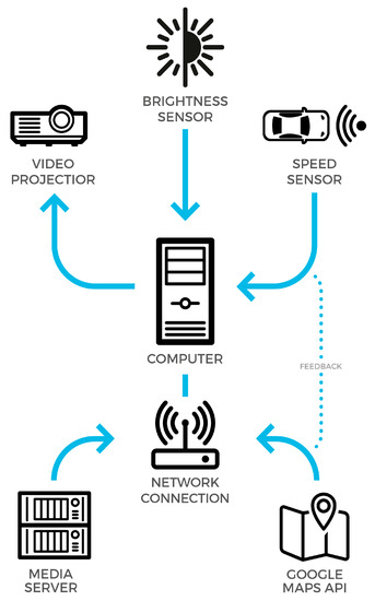 The projection system is designed to work autonomously by capturing data from the external environment and from web applications through an internet connection. A computer with a powerful graphics card locally handles the video stream while a node-based program synchronizes the different projectors. The computer, through an internet connection, captures video content from an online media server. This solution allows a remote upgrade and control. The video projection system is handled and managed by Google Traffic API data, a brightness sensor and a speed sensor. They support and integrate Google API data, which can suddenly switch from “slow” to “fast”. The system begins operating at sunset, when the brightness sensor indicates a favorable condition for video projection; this is the busiest time of the day in terms of traffic along both directions of the ring road adjacent to the sides of the showroom.