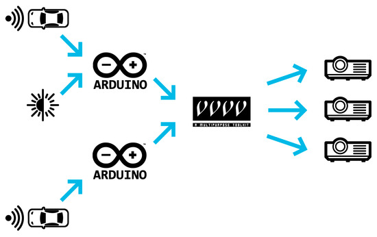 The system management scheme requires a computer for data analysis and video content management purposes. Its function is to convert data from physical sensors and online applications (API Google Maps) into video-projection run commands. High-performance computing components are required, but also an external graphics card to manage the video stream captured by the online media server. The software tested for system management is VVVV, a product developed for Windows® environment. It is a hybrid environment for graphical and text programming, based on nodes or directly with the code. VVVV is a versatile instrument that allows to connect physical inputs to digital outputs and vice versa. Traffic control data are detected by Google Maps application. Use is enabled by public, free Google APIs (an application programming interface), which is a set of procedures available for programmers to create applications that read and write data from Google services. As noted above, the system needs a physical control device for scanned data and a system for switching on/off the video projection stream. Two different types of sensors are connected to an Arduino® card, a small hardware to convert signals from sensors into computer-usable data (Figure 9).
