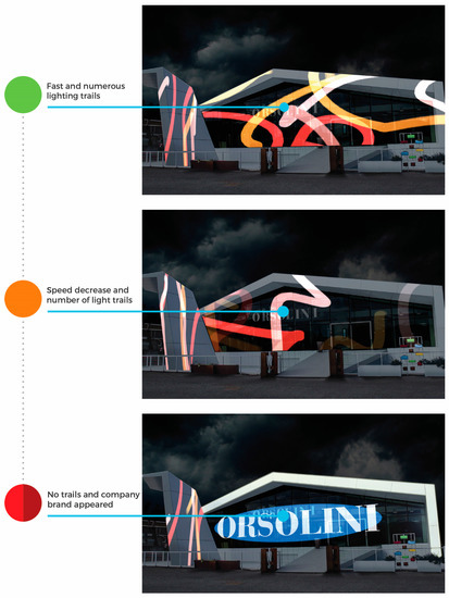The video installation (Figure 12) is based on an automatic speed control system in the surrounding road. When traffic is smooth, the structure will be crossed by bright flashes, gently moving to draw paths. As the travel speed decreases, the flashes decrease in number and their movements become gradually slower. In a heavy traffic situation, when people travel at low speed, the flashes disappear on the main facade and are replaced by a cyclical animation that enhances the company logo.