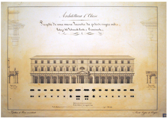- See Leonello Serafini, Progetto di nuove Facciate da potersi erigere nella Chiesa e Casa del Gesù, 1846, elevations, plans, section and details, India ink and watercolour, 70 × 130 cm (Perugia, Archive of the “Pietro Vannucci” Academy of Fine Arts, School of Architecture educational Fonds, inv. 536) and Leonello Serafini, Progetto di una nuova Facciata da potersi erigere nel Palazzo del Tribunale Civile e Criminale, 1846, elevation, plan, sections and details, India ink and watercolour, 70 × 101 cm (Perugia, Archive of the “Pietro Vannucci” Academy of Fine Arts, School of Architecture educational Fonds, inv. 535) [22].