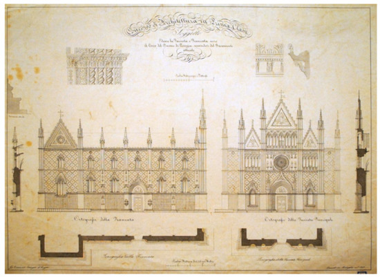 - See Giovanni Tommaso Stamigni, Ideare la Facciata e Fiancata verso il Corso del Duomo di Perugia, servendosi del Basamento attuale, 1849, elevations, plans, sections and details, India ink and watercolour, 68 × 92 cm (Perugia, Archive of the “Pietro Vannucci” Academy of Fine Arts, School of Architecture educational Fonds, inv. 571 bis). Note that even Stamigni’s teacher, Santini, intervened in those years in the internal reconfiguration of the Perugia cathedral, adopting the same language [20]. In addition, Stamigni collaborated with the academy several times in the courses held by Santini between 1857 and 1862 [23].
