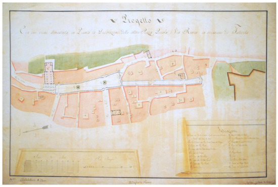 Besides, there are also the themes that fall into the so-called zero volume architecture (Appendix A, 16). For example, the Frontone park is the context for a burial monument to the condottiero and lord of Perugia Andrea Fortebraccio, which Annibale Boccanera conceived in 1828 on a podium on several levels connected by stairway ramps at first straight and then pincer shaped and dotted with statues, columns and celebratory friezes, which culminates in a dedicated sculptural group and which sets out scenographically the embankment in the area (Appendix A, 17). In 1834, also Napoleone Cherubini, taking into account the urban morphology, designed two circular basin twin fountains for the Fortezza square, as they are placed iconically in the visual cone that connects the current Baglioni street and corso Vannucci with the facade of the rocca Paolina fortress overlooking the square (Appendix A, 18). Also very significant for the repercussions on the city’s image is the “Decorazione” carry out for the “Festività”, proposed by Lardoni in 1823 (Figure 3) (Appendix A, 19). Unfortunately, in the archives of the Perugine institution it is possible to find only a planimetric map of this proposal, but this suggests that the scenic apparatus involves the whole area of the current Giacomo Matteotti square and Baglioni street, transforming the facades with decorated screenings that appear as scenic entrances near the accesses.