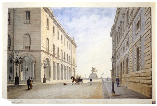 Nowadays we readily acknowledge the decisive role played by professors and students in the architectural evolution of the Perugian capital between the 19th and 20th centuries [24] (pp. 38, 50, n. 8). In particular, a large number of students, after completing their studies, contribute with their professional activity to transform its appearance, like Nazareno Biscarini, Guglielmo Calderini and Giovanni Santini just to mention a few (Appendix A, 20). In this sense, the fundamental role of the drawings, considered as a prelude to projects that in later years would have involved Perugia’s town centre is evident. For example, after the second half of the 19th century, the general focus converged on a type of research mostly concerned with urban developments regarding the problems arising from Italy’s post-unification transformation. In this context there are few images, such as Flaminio Rotondi’s perspective of 1878 for the study of the location of the new monument to Vittorio Emanuele II, that evoke the new contemporary city so effectively (Figure 4) (Appendix A, 21). In fact, the historical platea magna is not visible at the observer’s back, and the equestrian statue of the new sovereign stands in the background, just before the horizon on the Umbrian hills, which appears framed by the prospect of the innovative scenes of the Provincia palace by Alessandro Arienti and the headquarters of the Bank of Italy by Guglielmo Rossi, both conceived in 1873.