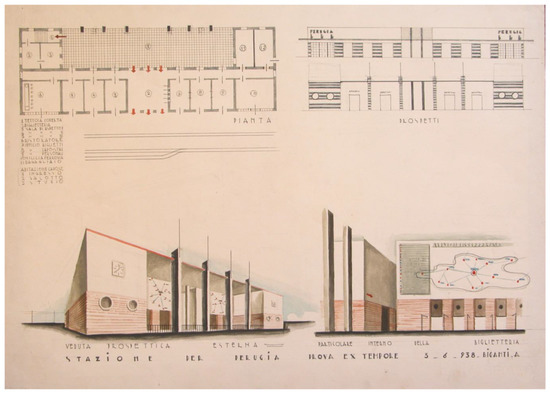 - Alberto Biganti, Stazione per Perugia, 1938, plan, elevations and prospettive, India ink and watercolour, 35 × 48 cm (Perugia, Archive of the “Pietro Vannucci” Academy of Fine Arts, School of Architecture educational Fonds, inv. 1194).