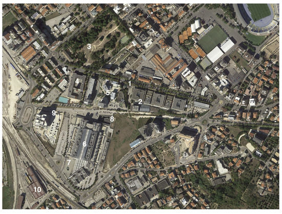 Pescara. Viale Pindaro. University Campus of Pescara. Gabriele d’Annunzio University. Satellite view, Google Maps, 2015. Highlights (1) the urban axis of Viale Pindaro, the tree-lined avenue that borders the university spaces; (2) the blocks of university buildings: Architecture, Foreign Languages and Literature, Economics and Management Sciences; The new Micara classroom; The Administrative Offices; (3) the Ex Caserma di Cocco Park; (4) the Fire Brigade; (5) Piazza Accademia, Studio SAUD project (2002–2007); (6) the Court of Pescara, project by Franco Agresta and Giulio Fioravanti (2005); (7) The Courthouse’s round fountain from the project by Ettore Spalletti (2004); (8) Monumento Caduti di Nassirya, designed by Giangiacomo D’Ardia (2005); (9) Residential tower building “Torre OperA”, designed by Mario Botta (2009–2011); (10) Tribunale Railway Station.