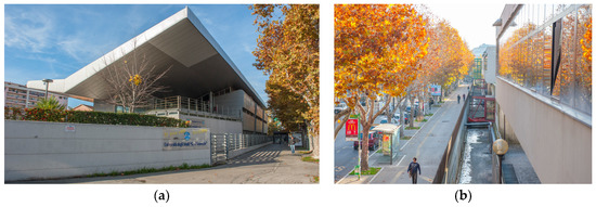 The so called Polo Pindaro is a complex urban area where the dynamics of the everyday activities of the students of the school of Architecture take place (Figure 2 and Figure 3a,b). A type of boulevard that is home to several spectacular specimens of sycamore trees, Viale Pindaro represents one of the stretches of a larger area of around 30 hectares with interesting features. Among these features we will observe: the position near Pineta Dannunziana, the city’s “green lung”; the presence of the ex-Caserma “Di Cocco” park; the area adjacent to the new Piazza Accademia; the proximity of Pescara Tribunale railway station to the railway line and the monolithic spaces of the Court of Pescara, which are home to two important installations—“Omaggio a Nassyria” by the architect Giangiacomo D’Ardia (2005) and the “Disco” fountain by the artist Ettore Spalletti (2004).