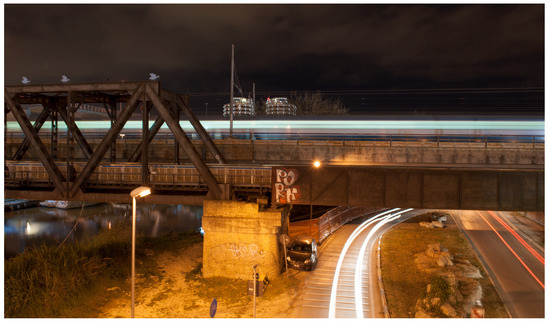 I walk. I wait. I think. I digest. I know. I measure. I use the ‘raw’ format. I recapture the night-time light. The river, the architecture, the city. The light is always altered, surreal. Pescara is a city made up of visual layers. I have endless possibilities. I reflect. I return the raw file, just as I took it. The extraordinary and elusive Pescara [9,10,11] (Figure 6).