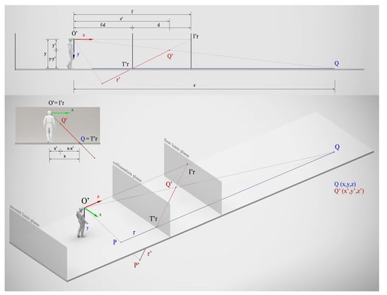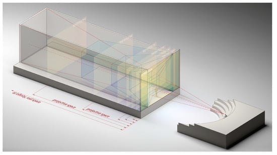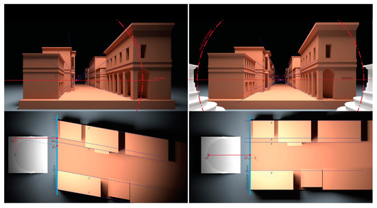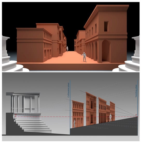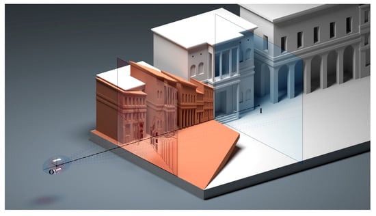 In the case of a relief perspective, this “measurement” is also conditioned by the contraction of the scenic space, which enhances or reduces the effects of compressing and dilating the space due to the above-mentioned movements. It alters the perception of depth and perspective, and therefore the real form of the object represented to which the perspective alludes. For the first displacement we imagine moving along the principal distance and we consider the configuration in which the first limit plane coincides with the collineation plane (the case of linear perspective). If the observer approaches the collineation plane, a scenic space is perceived that represents a real space that is more compressed than the true one. If, on the other hand, the observer moves away from the collineation plane, one will have the impression of viewing a more dilated space (Figure 4).