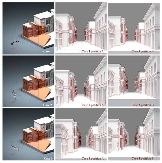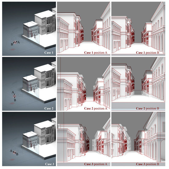 We can therefore determine a zone of “tolerance” for the restricted sight where the illusion is susceptible to tiny transformations that can be overlooked with respect to the perception of the overall scene. This zone is approximately ellipsoid shaped, situated with its major axis along the normal to the front of the scene, the intermediate axis in a vertical position, and the minor axis horizontal and parallel to the front of the scene. This tolerance is smallest for a linear perspective and increases noticeably in the case of a relief perspective, in which the space is enhanced, amplifying the perception of depth (Figure 6).